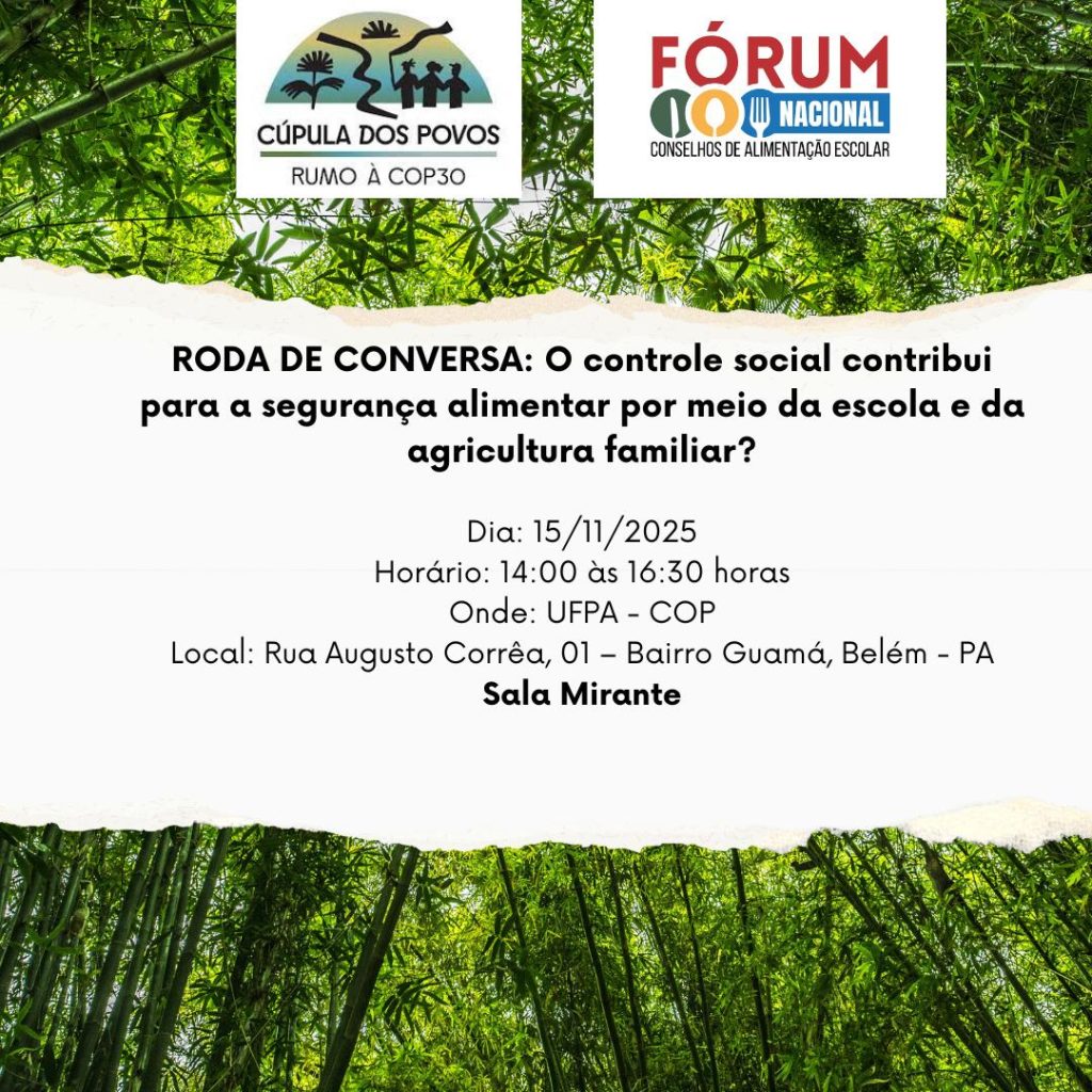 O Fórum Nacional dos Conselhos de Alimentação Escolar realiza no dia 15 de novembro, das 14h às 16h30, a roda de conversa “O controle social contribui para a segurança alimentar por meio da escola e da agricultura?”. O encontro integra a programação da Cúpula dos Povos rumo à COP30 e será realizado na Sala Mirante da Universidade Federal do Pará (UFPA), em Belém (PA). Não é necessário fazer inscrição.