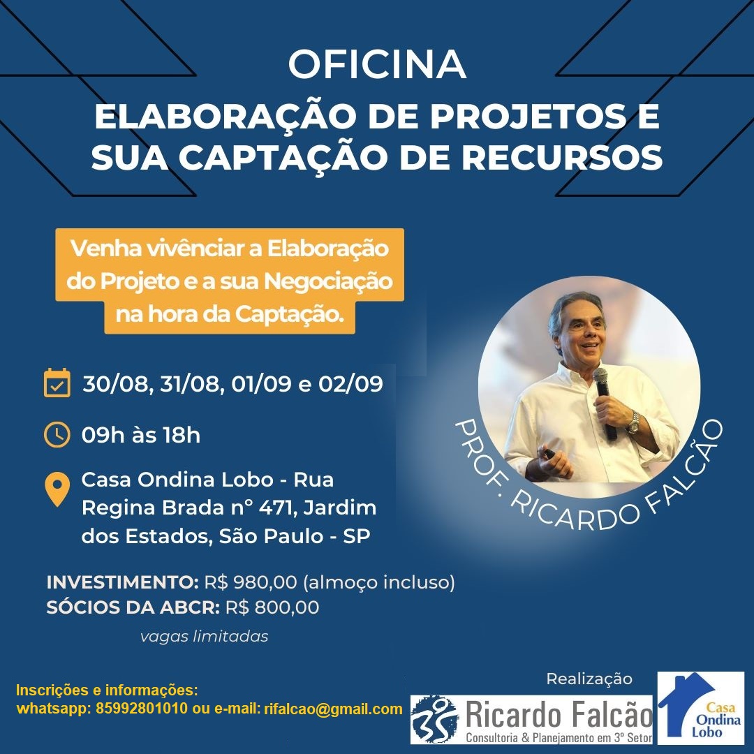 A cidade de São Paulo sediará uma imperdível oficina presencial sobre elaboração de projetos para captação de recursos nos dias 30 e 31 de agosto, 01 e 02 de setembro. O evento, que terá duração total de 32 horas, ocorrerá das 9h às 18h e proporcionará uma experiência enriquecedora de aprendizado com Ricardo Falcão, que possui mais de 50 anos de experiência na área de gerenciamento, elaboração de projetos e captação de recursos
